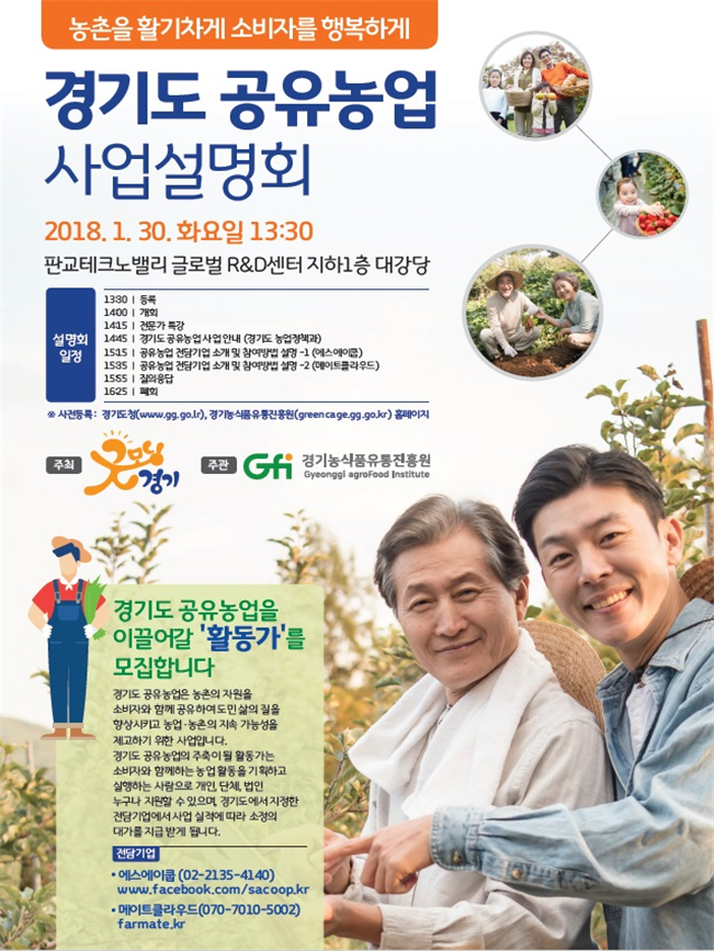 경기도와 경기농식품유통진흥원은 ‘경기도 공유농업’을 추진하기 위해 오는 30일 경기도 공유농업 사업 설명회를 개최한다고 17일 밝혔다. 이번 설명회는 이날 13시 30분 판교 테크노밸리 글로벌R&D센터 지하1층 대강당에서 진행되며, 경기도 공유농업 사업에 관심 있는 개인, 기업, 단체 등은 누구나 참여가 가능하다. 설명회에서는 경기도 공유농업 추진계획, 공유농업 전담기업 소개, 활동가·농업인·소비자의 공유농업 참여방법 및 지원방안 등에 대한 설명과 질의응답 시간을 가진다. 공유농업은 소비자의 먹거리에 대한 불안 해소 및 농업인 소득 창출을 위해 사회적 경제를 바탕으로 한 경기도만의 독창적인 생산·유통 시스템이다. 우선 생산자와 소비자를 연결할 수 있는 플랫폼을 구축하고, 생산자는 플랫폼을 통해 연결된 소비자와 농장을 공유해 농산물 생산, 체험 등을 함께한다. 소비자는 소정의 농장공유 대가를 농업인에게 지급해 영농자금으로 활용하고 생산된 농산물을 가져간다. 즉, 자신과 가족이 먹을 농산물 생산에 직접 참여함으로써 믿을 수 있는 먹을거리를 얻을 수 있게 되는 것이다. 또한 소비자가 생산품목과 재배방법을 농가와 함께 결정하는 등 소비자 맞춤형 계획생산을 통해 농가는 판로확보 문제를 해결할 수 있다. 경기도는 현재 공유농업 사업을 주관할 전담기업을 선정하여 플랫폼 시스템을 구축 중이며, 공유농업에 참여할 활동가·농업인·소비자 등을 모집할 계획이다. 김충범 경기도 농업정책과장은 “공유농업은 소비자에겐 믿을 수 있는 먹을거리를, 농업인에겐 새로운 소득 창출을 가져다 줄 수 있는 새로운 농정전략”이라며 “관심 있는 분들이 사업 설명회에 많이 참석하길 기대한다”고 말했다. |